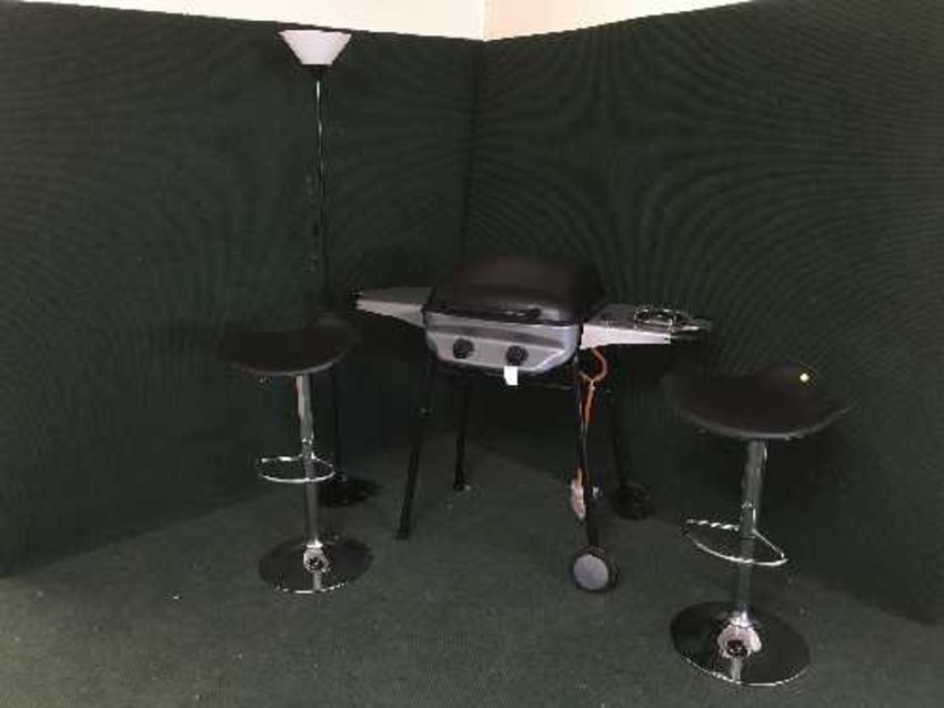 An Ohio gas BBQ, up-lighter and pair of gas lift bar stools