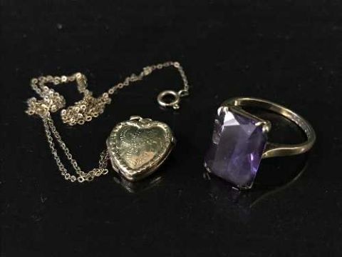 A 9ct gold dress ring, 9ct gold heart locket on chain