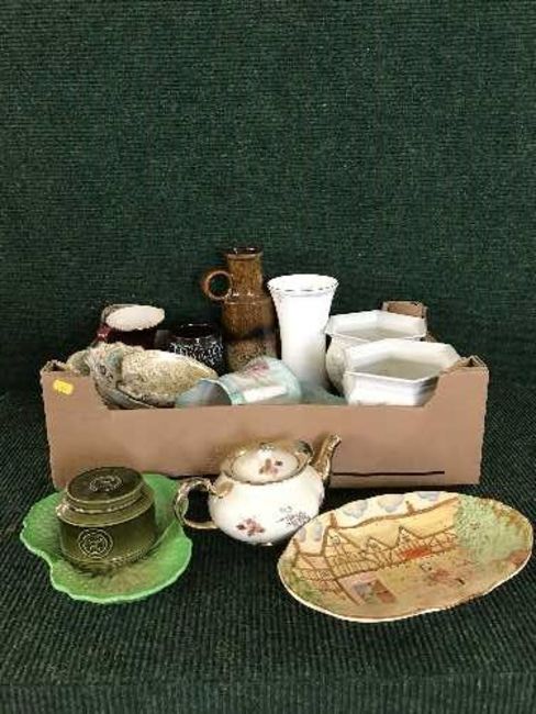 Four boxes of dinner plates, Winton planter, Doulton vase, West German vase etc