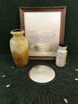 A metal wire framed mirror, oil on canvas and two West German vases