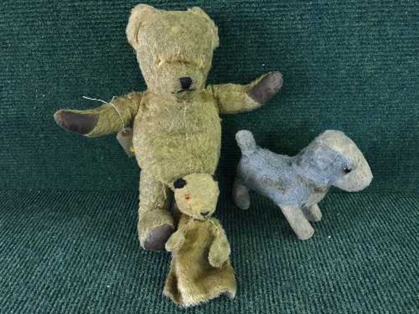 A mid 20th century mohair Teddy bear, soft toy dog and a Sooty puppet