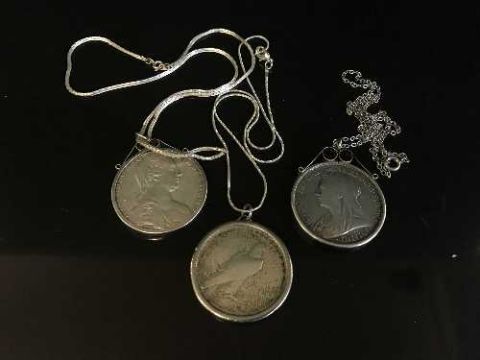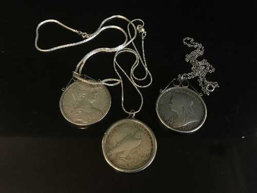 Three silver coin pendants to include a 1900 Crown, another continental coin and an American 1922 Eagle