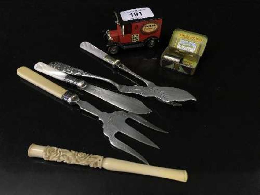 A sterling silver cake slice, EPNS cutlery, a carved bone cigarette holder, a Laurel safety razor in tin and a Days Gone car (Q)