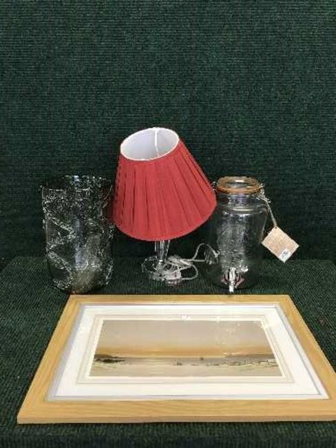 A box of glass vase, Kilner jar, table lamp and shade, seven assorted framed pictures
