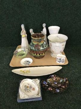 A tray of Spanish figures, Aynsley vase, Shorter pottery vase, pin dish etc