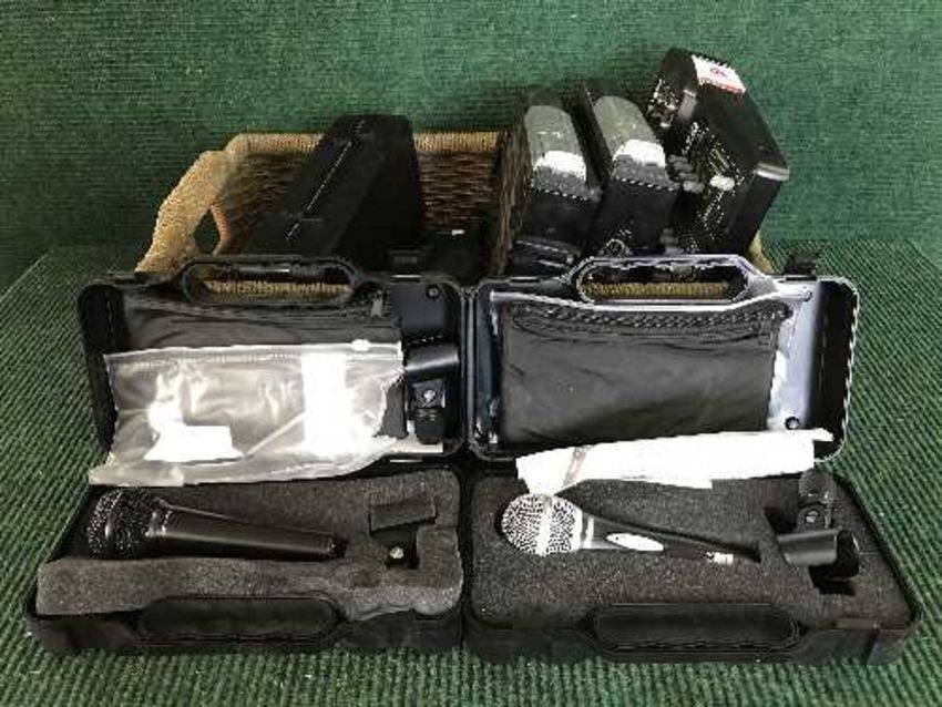 A box of Alto Professional mixing deck, two car CD changers and six assorted microphones