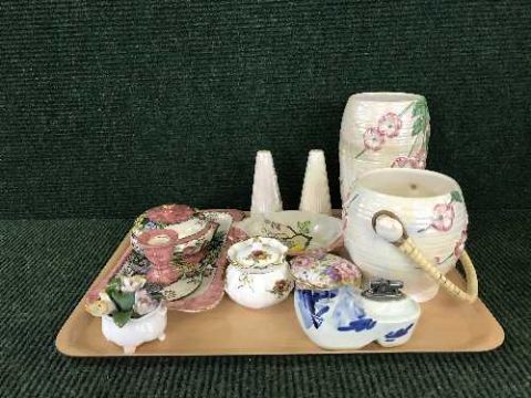 A tray of Maling lustre ware, trinket set, salt & pepper, vase, Royal Albert Country Roses preserve pot, posy etc