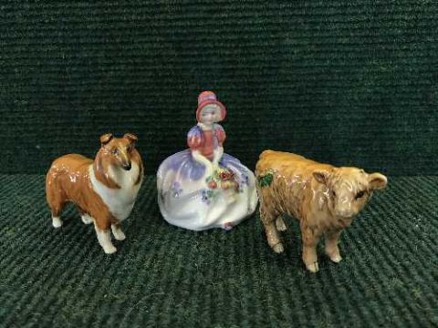 A Royal Doulton figure Monica HN 1467, Beswick calf figure and a Beswick Border Collie