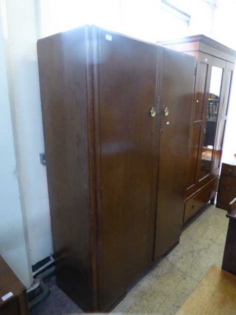 An oak double door wardrobe, a walnut wardrobe and bedside cabinet