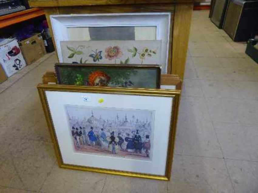 A collection of pictures and prints including map of Northumberland, Parisian street scenes, Needlework etc