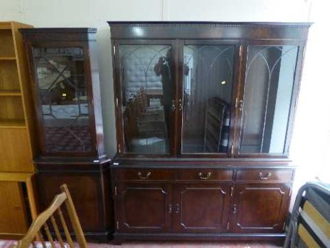 A mahogany triple door glazed bookcase together with matching corner cabinet