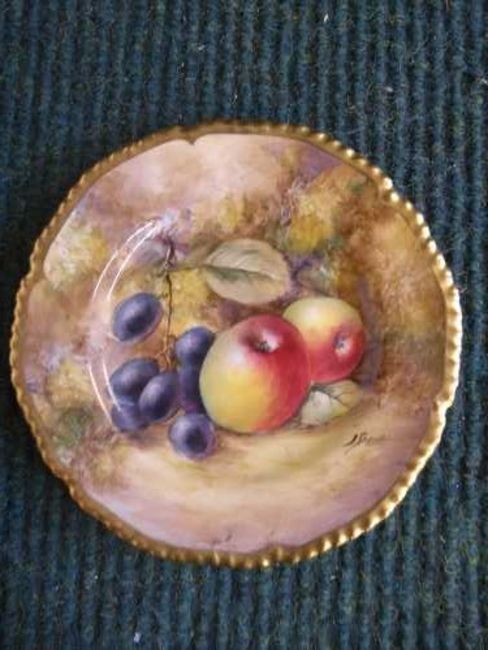 A Royal Worcester hand painted plate depicting fruit, with gilded border, signed J Smith, width 15 cm