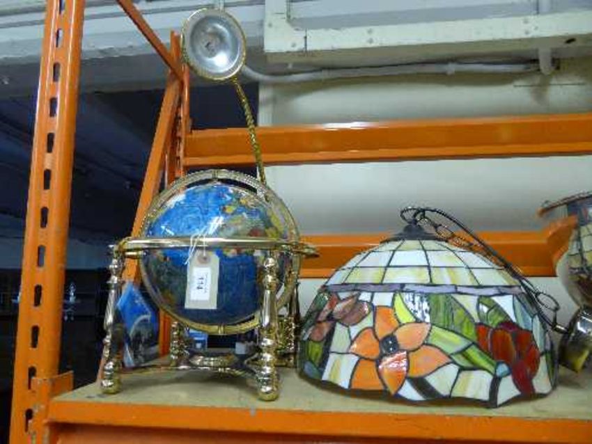 A Gemstone globe, brass angle poise lamp together with a Tiffany style light fitting