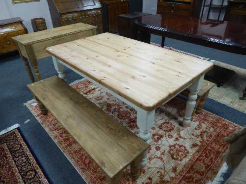 A pine farmhouse dining table, length 153cm, with two pine benches