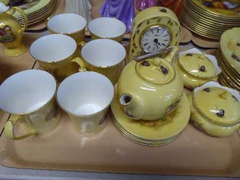A tray of sixteen pieces of Aynsley Orchard Gold china including a thirteen piece tea service, two lidded pots and a mantle clock