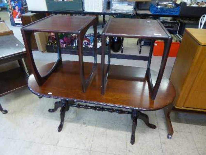 A contemporary oval mahogany coffee table together with pair of lamp tables