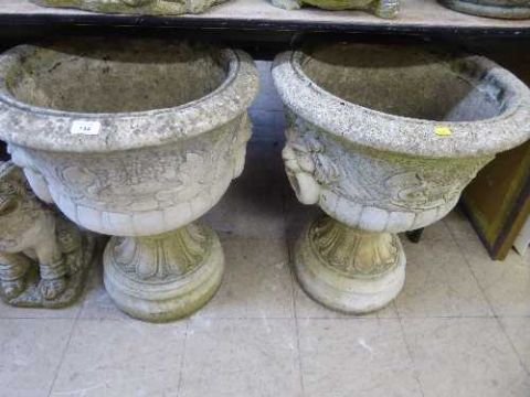 A pair of garden lion mask planters on stands