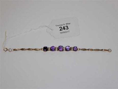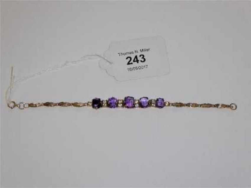 A 9ct gold and amethyst and cubic zirconia set bracelet, length 18cm