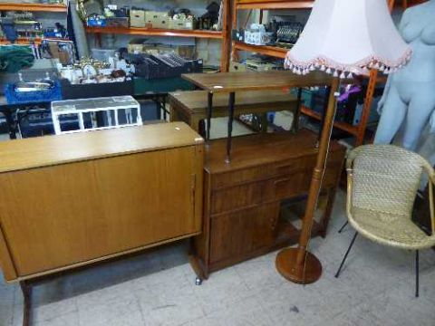 A teak television cabinet together with a teak radiogram cabinet, coffee table, standard lamp with shade and wicker armchair