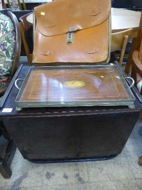 A small drop leaf bed table, leather case and an inlaid tray