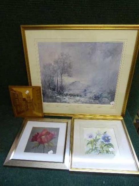 A box of assorted pictures and prints - signed print entitled "Roseberry Topping", E. Philips watercolour of flowers, marquetry panel etc