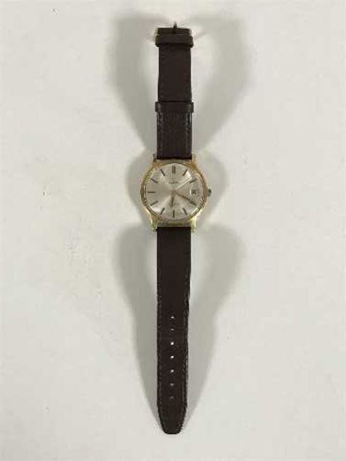 A Gents gold plated Omega Geneve wristwatch with silvered dial and date indication
