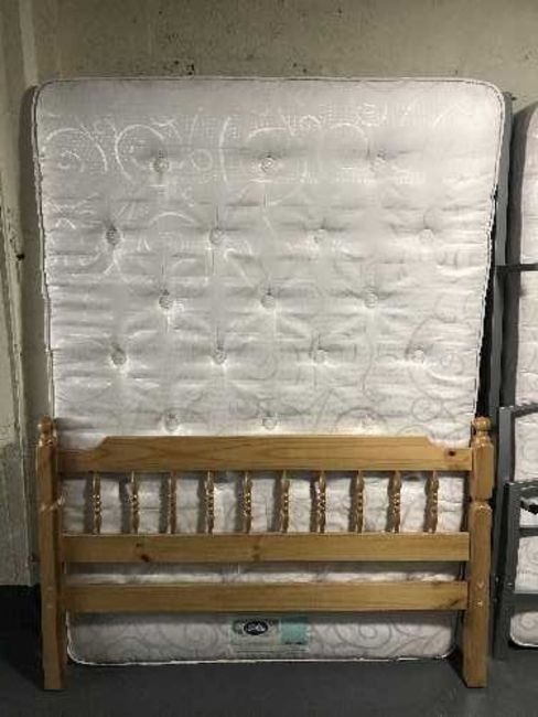 A 4'6 pine bed frame with silent night mirrorcoil mattress