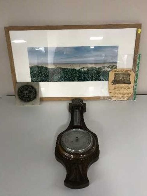 A pine framed print of St Annes, a Green Man wall plaque and a carved oak barometer