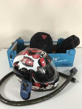 A box of two motor cycle helmets in carry bags, set of Motorola walkie talkies and motor cycle lock with key