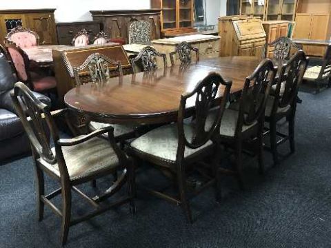 A Regency style twin pedestal table with leaf and eight shield back dining chairs