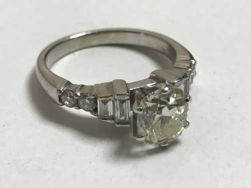A large solitaire diamond ring in 18ct white gold, the cushion shaped old cut stone approximately 1.7ct, very clean, the shoulders with round and baguette cut diamonds.