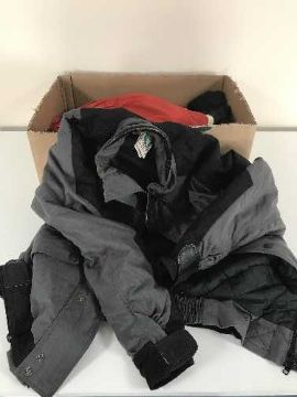 A box of two motor cycle jackets, thermal top and two pairs of gloves