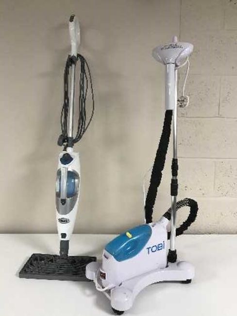 A Tobi steam cleaner together with a Shark floor steam cleaner and a kitchen pedal bin