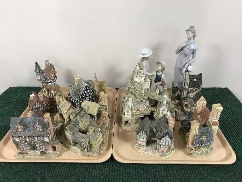 Two trays of two Lladro figures and nine David Winter cottages