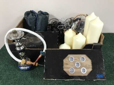 Two boxes of assorted CDs, DVDs, books, LED lighting, BT phone set, candles etc
