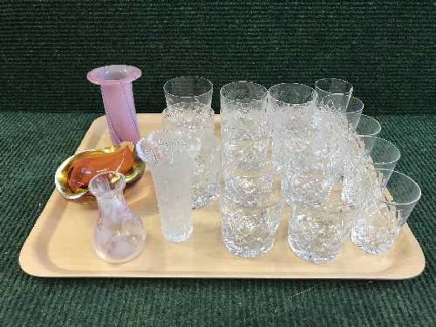 A tray of lead crystal drinking glasses, whisky tumblers, Caithness vase, decorative glass bowl etc