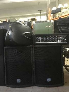A pair of NJD sound system speakers together with a T-mix Pm 400 four channel power mixer and DJ tech stage light