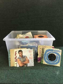 A box of assorted cds, 45's and 78's