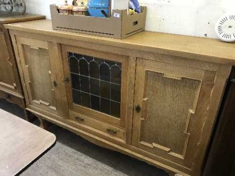 A continental oak triple door sideboard with leaded glass panel