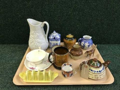 A tray of Devon ware teapots, Arthur woods tankard and preserve pot, Gibson and sons preserve pot, miniature Tang type horses etc