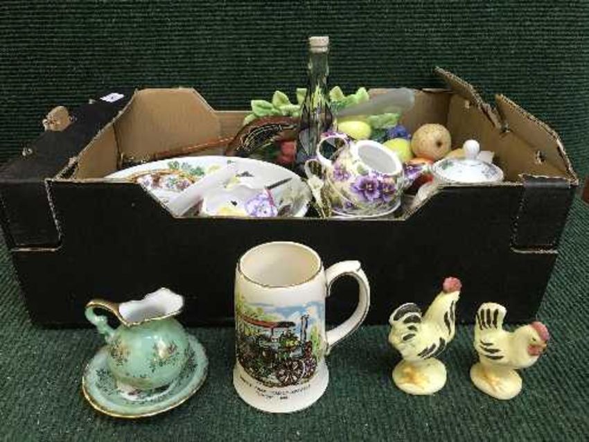 Two boxes of china including trinket dishes, china bells, egg cups, Portmerion, wall plates etc