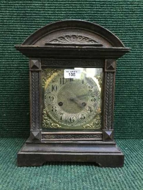 A late nineteenth century oak fourteen day strike mantle clock with brass face
