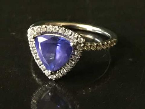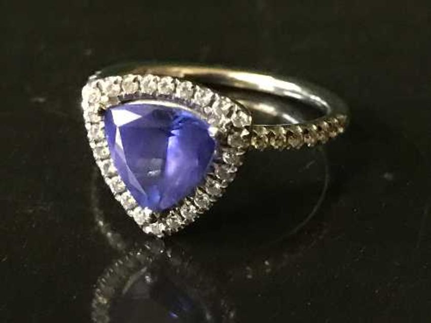 A 14ct white gold diamond and tanzanite ring, the large trillion cut tanzanite within a border of brilliant cut diamonds and diamond set shoulders, ring size M/N, accompanied by a GIE report stating the diamonds to weigh 0.29 carat, colour E-F, and the tanzanite to weigh 1.87 carat.