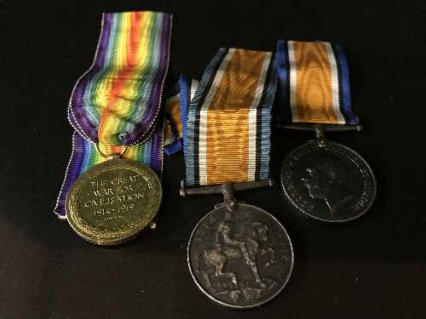 Two WW I medals on supsension ribbons arwarded to 7901 SPR T S Stafford R E, together with WW I medal awarded to 17903 Pte H Holmes LFIC R