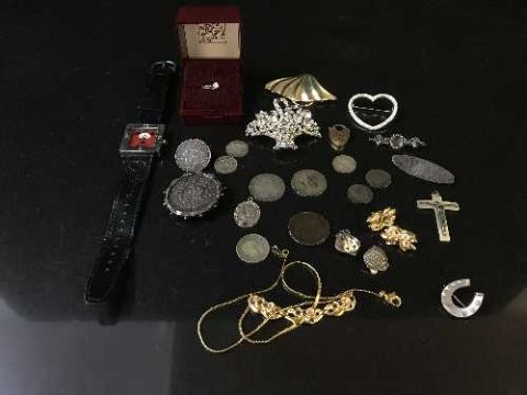 A collection of coins and silver jewellery - earring, brooches, St Christopher etc