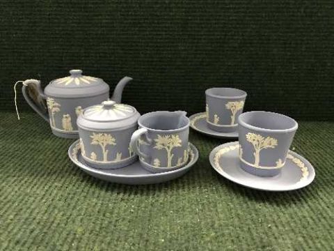 A tray of Wedgwood International society Brewster Cream jug, lidded sugar basin and tray, limited edition number 18/250, signed by Lord Wedgwood together with a Wedgwood jasper ware teapot limited edition numbered 18/250, together with two tea cups and saucers, all with certifications and boxes