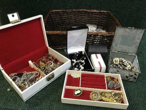 A basket of costume jewellery together with a basket of assorted brass and plated items