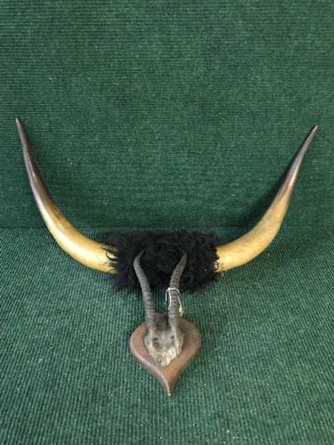 A pair of cow horns together with a pair of antlers mounted on a mahogany shield