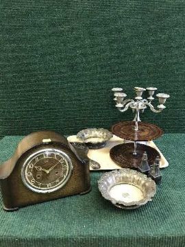 A tray of oak mantle clock, plated candelabrum, salt and pepper pot, 1930's chrome and wooden cake stand etc