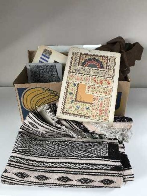 Two boxes of 1950's and later printed materials, fringed woolen rug, book plates, beads, unframed oil etc
